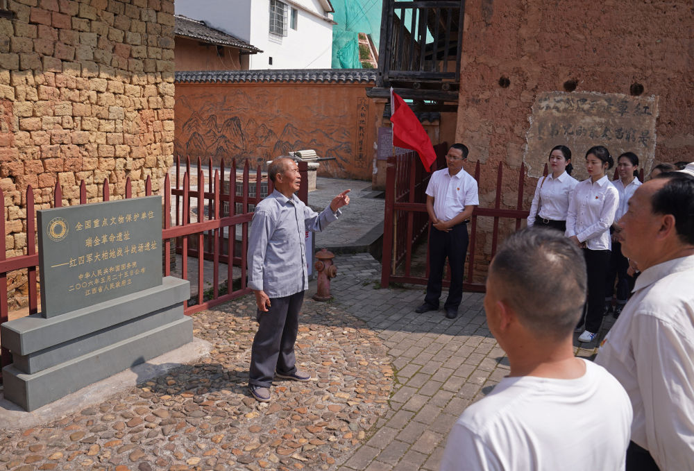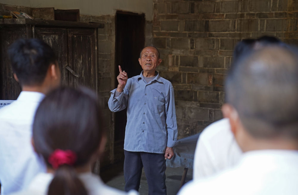 2025年3月27日,在位于大柏地乡的红四军部署大柏地战斗干部会议旧址,刘承汉为游客讲解战斗故事。