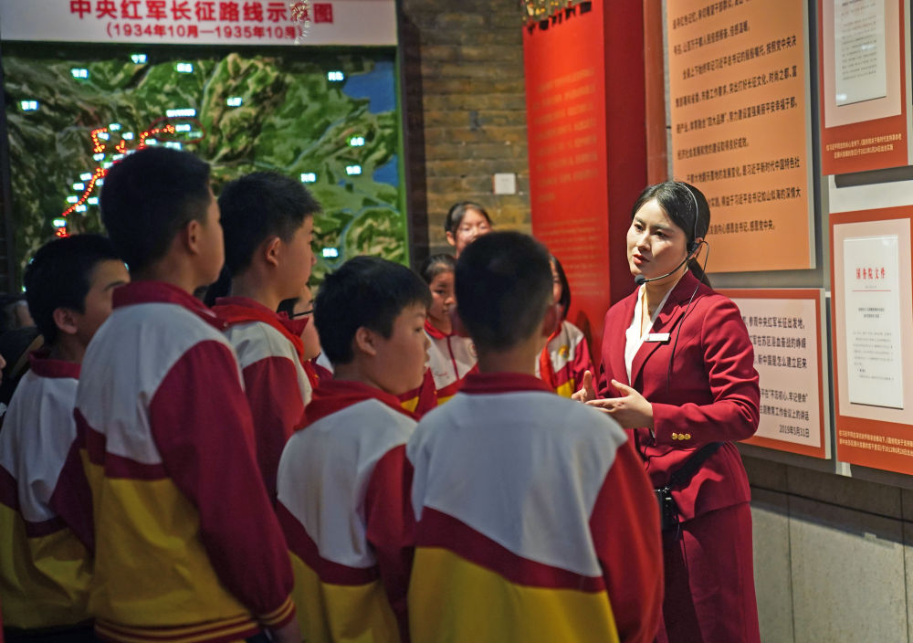 2025年3月28日,来自南昌市特殊教育学校的盲童讲解员匡威在纪念馆为游客讲解,目前他已担任志愿讲解员近一年。