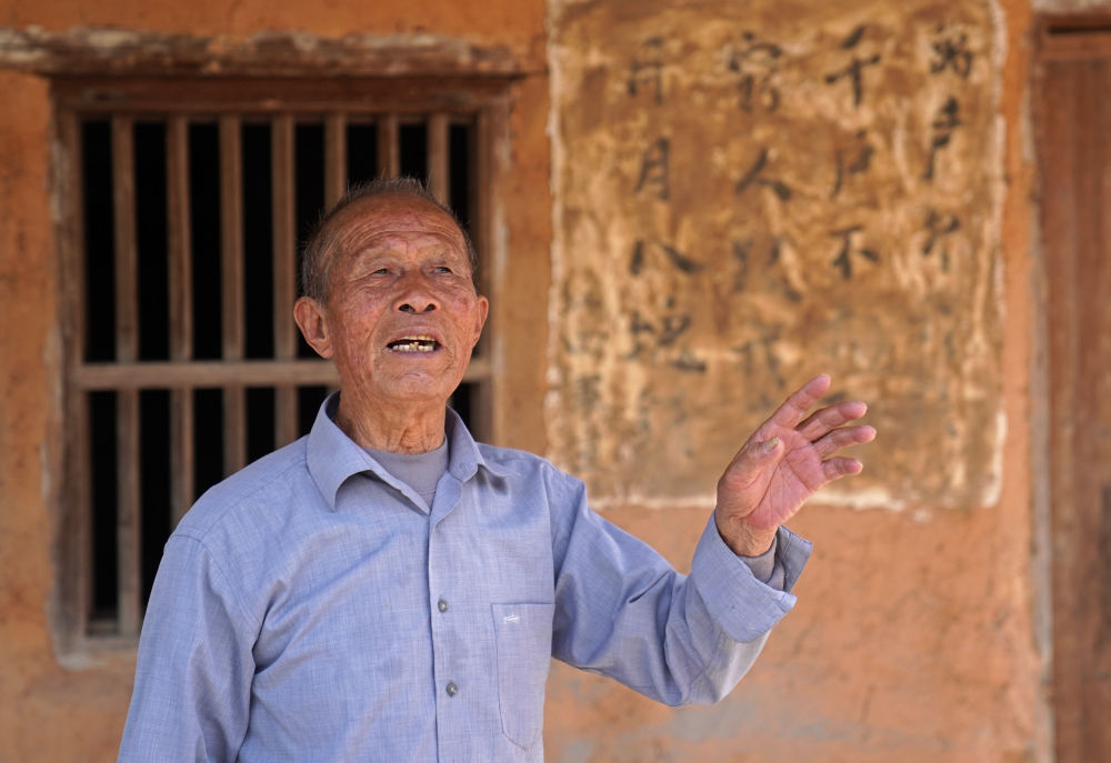 2025年3月27日,在大柏地村大柏地战斗战场遗址旁,刘承汉为游客讲解当年红军的征兵标语。