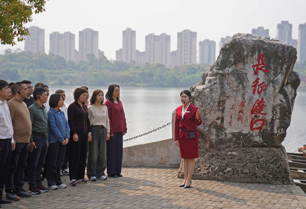 2025年3月26日,在于都县中央红军长征出发地纪念园内的“长征渡口”,钟雪燕为观众讲解“长征第一渡”的故事。